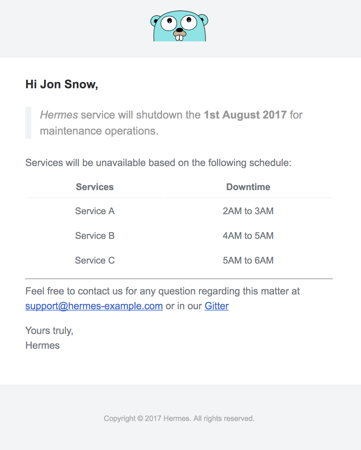# Hermes [![Build Status](https://travis-ci.org/matcornic/hermes.svg?branch=master)](https://travis-ci.org/matcornic/hermes) [![Go Report Card](https://goreportcard.com/badge/github.com/matcornic/hermes)](https://goreportcard.com/report/github.com/matcornic/hermes) [![Go Coverage](https://codecov.io/github/matcornic/hermes/coverage.svg)](https://codecov.io/github/matcornic/hermes/) [![Godoc](https://godoc.org/github.com/matcornic/hermes?status.svg)](https://godoc.org/github.com/matcornic/hermes) Hermes is the Go port of the great [mailgen](https://github.com/eladnava/mailgen) engine for Node.js. Check their work, it's awesome! It's a package that generates clean, responsive HTML e-mails for sending transactional e-mails (welcome e-mails, reset password e-mails, receipt e-mails and so on), and associated plain text fallback. # Demo # Usage First install the package: ``` go get -u github.com/matcornic/hermes ``` Then, start using the package by importing and configuring it: ```go // Configure hermes by setting a theme and your product info h := hermes.Hermes{ // Optional Theme // Theme: new(Default) Product: hermes.Product{ // Appears in header & footer of e-mails Name: "Hermes", Link: "https://example-hermes.com/", // Optional product logo Logo: "http://www.duchess-france.org/wp-content/uploads/2016/01/gopher.png", }, } ``` Next, generate an e-mail using the following code: ```go email := hermes.Email{ Body: hermes.Body{ Name: "Jon Snow", Intros: []string{ "Welcome to Hermes! We're very excited to have you on board.", }, Actions: []hermes.Action{ { Instructions: "To get started with Hermes, please click here:", Button: hermes.Button{ Color: "#22BC66", // Optional action button color Text: "Confirm your account", Link: "https://hermes-example.com/confirm?token=d9729feb74992cc3482b350163a1a010", }, }, }, Outros: []string{ "Need help, or have questions? Just reply to this email, we'd love to help.", }, }, } // Generate an HTML email with the provided contents (for modern clients) emailBody, err := h.GenerateHTML(email) if err != nil { panic(err) // Tip: Handle error with something else than a panic ;) } // Generate the plaintext version of the e-mail (for clients that do not support xHTML) emailText, err := h.GeneratePlainText(email) if err != nil { panic(err) // Tip: Handle error with something else than a panic ;) } // Optionally, preview the generated HTML e-mail by writing it to a local file err = ioutil.WriteFile("preview.html", []byte(emailBody), 0644) if err != nil { panic(err) // Tip: Handle error with something else than a panic ;) } ``` This code would output the following HTML template: And the following plain text: ``` ------------ Hi Jon Snow, ------------ Welcome to Hermes! We're very excited to have you on board. To get started with Hermes, please click here: https://hermes-example.com/confirm?token=d9729feb74992cc3482b350163a1a010 Need help, or have questions? Just reply to this email, we'd love to help. Yours truly, Hermes - https://example-hermes.com/ Copyright © 2017 Hermes. All rights reserved. ``` > Theme templates will be embedded in your application binary. If you want to use external templates (for configuration), use your own theme by implementing `hermes.Theme` interface with code searching for your files. ## More Examples * [Welcome](examples/welcome.go) * [Receipt](examples/receipt.go) * [Password Reset](examples/reset.go) * [Maintenance](examples/maintenance.go) To run the examples, go to `examples` folder, then run `go run *.go`. HTML and Plaintext example should be created in given theme folders. ## Plaintext E-mails To generate a [plaintext version of the e-mail](https://litmus.com/blog/best-practices-for-plain-text-emails-a-look-at-why-theyre-important), simply call `GeneratePlainText` function: ```go // Generate plaintext email using hermes emailText, err := h.GeneratePlainText(email) if err != nil { panic(err) // Tip: Handle error with something else than a panic ;) } ``` ## Supported Themes The following open-source themes are bundled with this package: * `default` by [Postmark Transactional Email Templates](https://github.com/wildbit/postmark-templates) * `flat`, slightly modified from [Postmark Transactional Email Templates](https://github.com/wildbit/postmark-templates) ## RTL Support To change the default text direction (left-to-right), simply override it as follows: ```go // Configure hermes by setting a theme and your product info h := hermes.Hermes { // Custom text direction TextDirection: hermes.TDRightToLeft, } ``` ## Language Customizations To customize the e-mail's greeting ("Hi") or signature ("Yours truly"), supply custom strings within the e-mail's `Body`: ```go email := hermes.Email{ Body: hermes.Body{ Greeting: "Dear", Signature: "Sincerely", }, } ``` To use a custom title string rather than a greeting/name introduction, provide it instead of `Name`: ```go email := hermes.Email{ Body: hermes.Body{ // Title will override `Name` Title: "Welcome to Hermes", }, } ``` To customize the `Copyright`, override it when initializing `Hermes` within your `Product` as follows: ```go // Configure hermes by setting a theme and your product info h := hermes.Hermes{ // Optional Theme // Theme: new(Default) Product: hermes.Product{ // Appears in header & footer of e-mails Name: "Hermes", Link: "https://example-hermes.com/", // Custom copyright notice Copyright: "Copyright © 2017 Dharma Initiative. All rights reserved." }, } ``` To use a custom fallback text at the end of the email, change the `TroubleText` field of the `hermes.Product` struct. The default value is `If you’re having trouble with the button '{ACTION}', copy and paste the URL below into your web browser.`. The `{ACTION}` placeholder will be replaced with the corresponding text of the supplied action button: ```go // Configure hermes by setting a theme and your product info h := hermes.Hermes{ // Optional Theme // Theme: new(Default) Product: hermes.Product{ // Custom trouble text TroubleTex