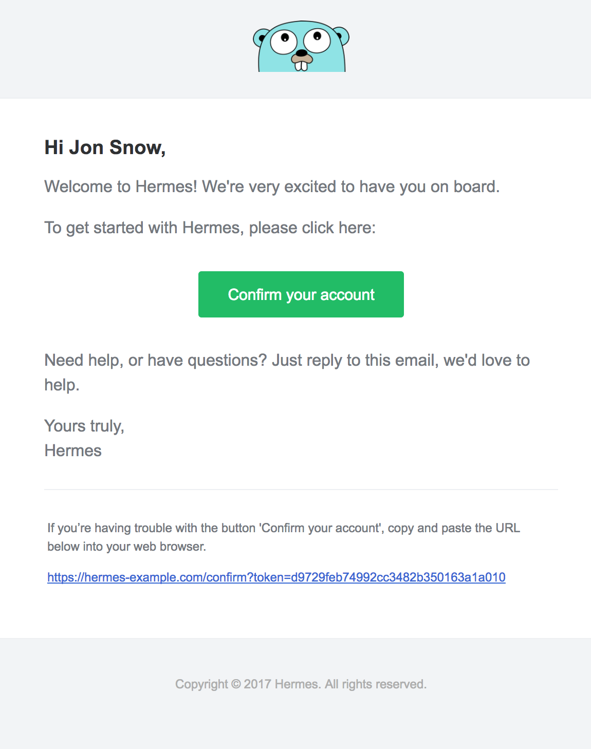 # Hermes [![Build Status](https://travis-ci.org/matcornic/hermes.svg?branch=master)](https://travis-ci.org/matcornic/hermes) [![Go Report Card](https://goreportcard.com/badge/github.com/matcornic/hermes)](https://goreportcard.com/report/github.com/matcornic/hermes) [![Go Coverage](https://codecov.io/github/matcornic/hermes/coverage.svg)](https://codecov.io/github/matcornic/hermes/) [![Godoc](https://godoc.org/github.com/matcornic/hermes?status.svg)](https://godoc.org/github.com/matcornic/hermes) Hermes is the Go port of the great [mailgen](https://github.com/eladnava/mailgen) engine for Node.js. Check their work, it's awesome! It's a package that generates clean, responsive HTML e-mails for sending transactional e-mails (welcome e-mails, reset password e-mails, receipt e-mails and so on), and associated plain text fallback. # Demo # Usage First install the package: ``` go get -u github.com/matcornic/hermes ``` Then, start using the package by importing and configuring it: ```go // Configure hermes by setting a theme and your product info h := hermes.Hermes{ // Optional Theme // Theme: new(Default) Product: hermes.Product{ // Appears in header & footer of e-mails Name: "Hermes", Link: "https://example-hermes.com/", // Optional product logo Logo: "http://www.duchess-france.org/wp-content/uploads/2016/01/gopher.png", }, } ``` Next, generate an e-mail using the following code: ```go email := hermes.Email{ Body: hermes.Body{ Name: "Jon Snow", Intros: []string{ "Welcome to Hermes! We're very excited to have you on board.", }, Actions: []hermes.Action{ { Instructions: "To get started with Hermes, please click here:", Button: hermes.Button{ Color: "#22BC66", // Optional action button color Text: "Confirm your account", Link: "https://hermes-example.com/confirm?token=d9729feb74992cc3482b350163a1a010", }, }, }, Outros: []string{ "Need help, or have questions? Just reply to this email, we'd love to help.", }, }, } // Generate an HTML email with the provided contents (for modern clients) emailBody, err := h.GenerateHTML(email) if err != nil { panic(err) // Tip: Handle error with something else than a panic ;) } // Generate the plaintext version of the e-mail (for clients that do not support xHTML) emailText, err := h.GeneratePlainText(email) if err != nil { panic(err) // Tip: Handle error with something else than a panic ;) } // Optionally, preview the generated HTML e-mail by writing it to a local file err = ioutil.WriteFile("preview.html", []byte(emailBody), 0644) if err != nil { panic(err) // Tip: Handle error with something else than a panic ;) } ``` This code would output the following HTML template: And the following plain text: ``` ------------ Hi Jon Snow, ------------ Welcome to Hermes! We're very excited to have you on board. To get started with Hermes, please click here: https://hermes-example.com/confirm?token=d9729feb74992cc3482b350163a1a010 Need help, or have questions? Just reply to this email, we'd love to help. Yours truly, Hermes - https://example-hermes.com/ Copyright © 2017 Hermes. All rights reserved. ``` > Theme templates will be embedded in your application binary. If you want to use external templates (for configuration), use your own theme by implementing `hermes.Theme` interface with code searching for your files. ## More Examples * [Welcome](examples/welcome.go) * [Receipt](examples/receipt.go) * [Password Reset](examples/reset.go) * [Maintenance](examples/maintenance.go) To run the examples, go to `examples` folder, then run `go run *.go`. HTML and Plaintext example should be created in given theme folders. ## Plaintext E-mails To generate a [plaintext version of the e-mail](https://litmus.com/blog/best-practices-for-plain-text-emails-a-look-at-why-theyre-important), simply call `GeneratePlainText` function: ```go // Generate plaintext email using hermes emailText, err := h.GeneratePlainText(email) if err != nil { panic(err) // Tip: Handle error with something else than a panic ;) } ``` ## Supported Themes The following open-source themes are bundled with this package: * `default` by [Postmark Transactional Email Templates](https://github.com/wildbit/postmark-templates) * `flat`, slightly modified from [Postmark Transactional Email Templates](https://github.com/wildbit/postmark-templates) ## RTL Support To change the default text direction (left-to-right), simply override it as follows: ```go // Configure hermes by setting a theme and your product info h := hermes.Hermes { // Custom text direction TextDirection: hermes.TDRightToLeft, } ``` ## Language Customizations To customize the e-mail's greeting ("Hi") or signature ("Yours truly"), supply custom strings within the e-mail's `Body`: ```go email := hermes.Email{ Body: hermes.Body{ Greeting: "Dear", Signature: "Sincerely", }, } ``` To use a custom title string rather than a greeting/name introduction, provide it instead of `Name`: ```go email := hermes.Email{ Body: hermes.Body{ // Title will override `Name` Title: "Welcome to Hermes", }, } ``` To customize the `Copyright`, override it when initializing `Hermes` within your `Product` as follows: ```go // Configure hermes by setting a theme and your product info h := hermes.Hermes{ // Optional Theme // Theme: new(Default) Product: hermes.Product{ // Appears in header & footer of e-mails Name: "Hermes", Link: "https://example-hermes.com/", // Custom copyright notice Copyright: "Copyright © 2017 Dharma Initiative. All rights reserved." }, } ``` To use a custom fallback text at the end of the email, change the `TroubleText` field of the `hermes.Product` struct. The default value is `If you’re having trouble with the button '{ACTION}', copy and paste the URL below into your web browser.`. The `{ACTION}` placeholder will be replaced with the corresponding text of the supplied action button: ```go // Configure hermes by setting a theme and your product info h := hermes.Hermes{ // Optional Theme // Theme: new(Default) Product: hermes.Product{ // Custom trouble text TroubleTex