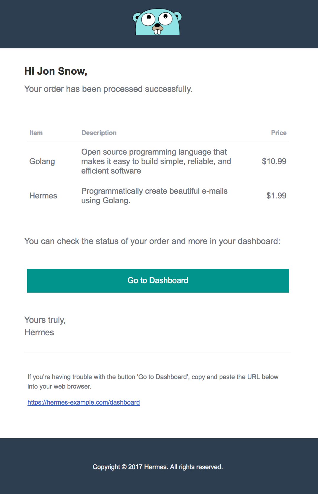 Hermes is the Go port of the great mailgen engine for Node.js. Check their work, it's awesome! It's a package that generates clean, responsive HTML e-mails for sending transactional e-mails (welcome e-mails, reset password e-mails, receipt e-mails and so on), and associated plain text fallback.