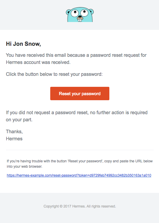 Hermes is the Go port of the great mailgen engine for Node.js. Check their work, it's awesome! It's a package that generates clean, responsive HTML e-mails for sending transactional e-mails (welcome e-mails, reset password e-mails, receipt e-mails and so on), and associated plain text fallback.